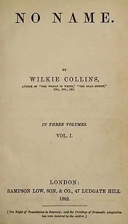 No Name is an 1862 novel by Wilkie Collins. Illegitimacy is a major theme of the novel. It was originally serialised in Charles Dickens's magazine All the Year Round before book publication. It is the second of his four "great novels", released after The Woman in White (1860) and before Armadale (1866) and The Moonstone (1868).