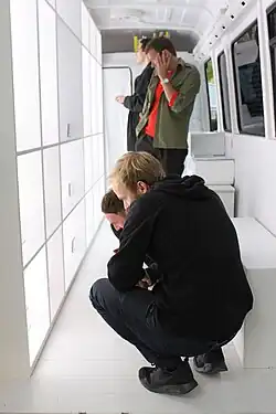 Since 2015, the No Show Museum has been on a world tour with a converted bus. Inside, the mobile museum is a futuristic white cube (4 m long, 2 m wide, 2.10 m high), in which the current special exhibition is shown. It also offers access to the virtual collection via ipad stations and includes a selection of conceptual souvenir items related to the museum’s theme. The black-painted exterior of the bus functions as a writable surface for exhibition announcements. .[4]