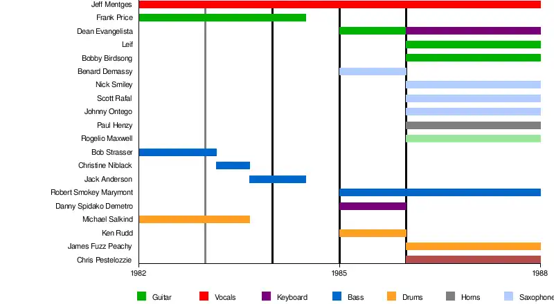| Past members | Dean Evangelista Eric Leifert Jeff Mentges (vocals) Greg Miller Brian Nelson Buck Parr James Peachey Frank Price (guitar) Jack Anderson Michael Salkind (drums) Bob Strasser (bass) Christine Niblack (bass) |