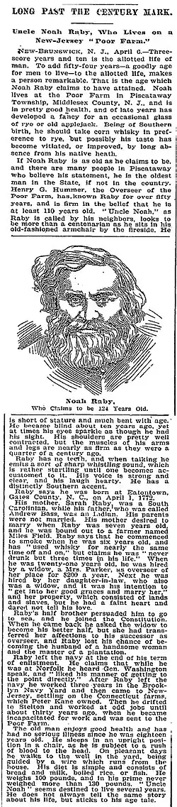 Noah Raby, also a pauper, an inmate of the almshouse at Piscatawa, [sic] near New Brunswick, New Jersey, celebrated what he said was his 125th birthday on April 1, 1897. He was born in Gates County, North Carolina, his father being a full-blooded Indian named Andrew Bass. He says he was discharged from the man-of-war "Braudywine" [sic] eighty-four years ago, but has lost his discharge papers; that he heard Washington make an angry public address at Norfolk; that he began smoking when he was five years old, and has continued to smoke ever since, and has always been a drinker of liquors. It is on his unsupported statement that the people of the neighborhood regard him with local pride.[4]