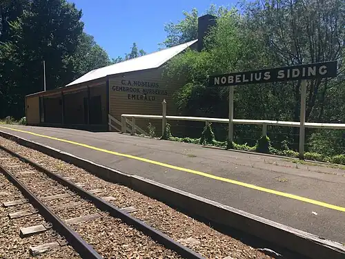 Nobelius Siding is situated on the Puffing Billy Railway in Emerald. The siding was built in 1904[1] to serve the adjacent packing shed, built in the same year, from which nursery seedlings and plants were shipped throughout Australia by C.A. Nobelius' Gembrook Nurseries.[2] The Nobelius nursery was once the largest plant nursery in the Southern Hemisphere with 200,000 trees grown on 180 hectares.[3]