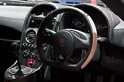 The interior of the car has twin hide upholstery and gloss carbon-fibre trim as standard. Buyers have the choice to choose from leather, suede, or alcantra upholstery along with trim choices of knurled wood or carbon fibre and wool carpeting. The switches and instrumentation are bespoke to the M600, although some components are shared with Jaguar and Aston Martin models. The car is equipped with an adjustable steering column and driver's seat while the pedals are offset to the left. The pedals are adjusted according to the owner's preference in order to provide a good driving position. A highlight of the interior is the engine power control knob, similar to Ferrari's Manettino dial, which allows the driver to choose from variable engine power outputs along with related turbo boost pressure (Road, Track and Race). The knob is present ahead of the gearshift knob on the dashboard. A traction control switch activates the limited traction control which is present to avoid oversteer. The interior is based on simplicity and is driver focused, inspired by the Ferrari F40 and due to this, it does away with climate control and modern infotainment systems.[4][6]