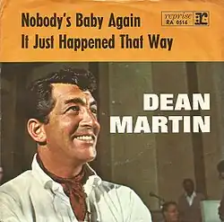 "Nobody's Baby Again" is a song written by Baker Knight, which was released in 1966 by Dean Martin. The song spent 6 weeks on the Billboard Hot 100 chart, peaking at No. 60,[1] while reaching No. 6 on Billboard's Easy Listening chart.[2][3] In Canada, the song reached No. 48 on the RPM 100[4] and No. 17 on the CHUM Hit Parade.[5]