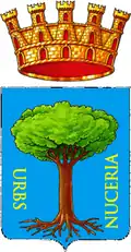 «light blue, uprooted walnut, green, fruity golden, accompanied on the sides by the words "Urbs Nuceria" in golden Roman capital letters, placed vertically, the word Urbs in the border on the right side and with the initial U upwards, the word Nuceria in the border on the left side and with the final A upwards. Exterior city ornaments.» |