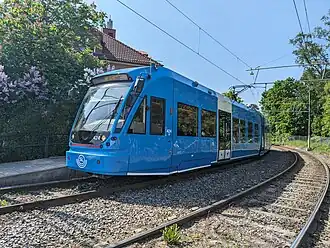 The line is served by 30 meter long Flexity Swift trams.[5] The depot and traffic control center at Alvik are shared with Tvärbanan. As of 2018, new CAF Urbos trams (A35) were ordered for the Tvärbanan extension to Solna. But after Tvärbanan modernisation (23/3 to 2/10, 2017) all A35 were put on whole Tvärbanan, 28% are A35 and 72% are A32.