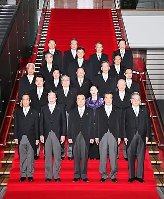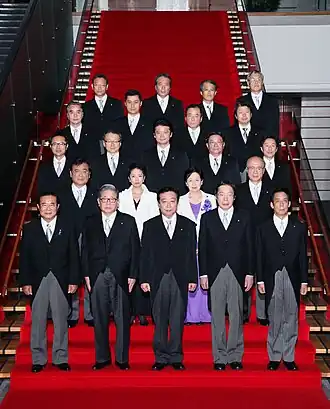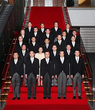 ![]() Prime Minister Yoshihiko Noda (front row, centre) with the newly-elected cabinet inside the Kantei, September 2, 2011 | |