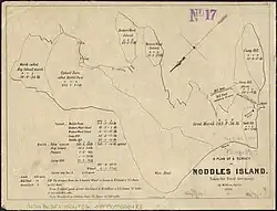 During the American Revolutionary War "on this same island was fought the second battle of the Revolution (also known as the Battle of Chelsea Creek), and the first in which the American artillery was used."[2] After the British left Boston harbor, the island was used as a hospital for the French Fleet in 1780 who dubbed it ""L'ile de France'" and buried numerous troops on the island. Following this the island was heavily fortified by the Bostonians with an earthwork known as "Noddle's Island Fort", a rebuilding of a 19-gun British work, later rebuilt and renamed Fort Strong in the War of 1812 after Governor Caleb Strong.[4]