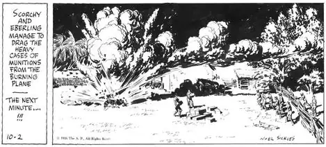 Sickles was assigned to the action/adventure comic Scorchy Smith, whose creator, John Terry, was suffering from tuberculosis. Loosely modeled on Charles Lindbergh, Scorchy was a pilot-for-hire who flew into numerous high-octane globe-trotting adventures. The series, which started in 1930, was heavily influenced by Roy Crane’s adventure strip Wash Tubbs. Sickles initially illustrated the strip as a ghost artist, but he signed his own name after Terry's 1934 death.