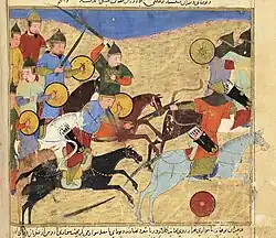 ![]() Troops of Nogai Khan on the offensive, at the Battle between Toqta Khan and Nogai. Circa 1430 miniature | |