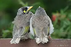 The noisy miner has some of the largest group sizes of any communally breeding bird, with up to twenty males and one female attending a single brood.[56] Only males help with a nest, and while many birds may be associated with a particular brood, some males devote all their time to a single nest, while others spread their helping efforts across five or six nests.[51] Behavioural evidence and genetic testing indicate that helpers are male offspring of the breeding pair, or full siblings of the male parent.[51] Males nearly always bring food to the nestling singly, and if several arrive at once, one will pass food to a nestling while the others wait. The female leaves the nest quickly when a male bird arrives, and never takes food from one of the helpers. Communal feeding of the young increases after fledging, and the young beg for food with constant 'chip chip' calls and gaping mouths. The female rarely feeds the young birds after they have fledged.[55]