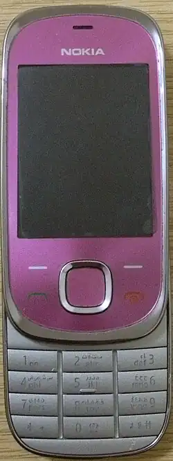 The Nokia 7230 is a slim slider with a glossy, curvaceous design. The sides have a chrome-like finish with a dedicated button for the camera and a matte textured plastic battery cover on the back. While the phone looks deceptively solid, once you take it in hand, its flimsy low-end nature becomes evident. The screen is surrounded by a finely textured panel that covers two soft keys, a send button and an end button with a five way d-pad within. This panel comes in pink or graphite, as does the battery cover.[1]