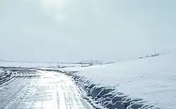The Nome–Council Highway begins at a T intersection with Nome Bypass Road and Front Street; the former route travels north from the intersection and forms a partial loop around the main built-up area of Nome, while the latter extends westward from the intersection along the Nome seawall into the city. The highway travels southeastward from this intersection, parallel to the Bering Sea. For the first mile, the route passes East End Park Ponds to the north, a city park which contains the Swanberg Dredge and is an important point for bird migration.[2][3] After approximately 1.3 miles (2.1 km), the highway intersects Kougarok Road, another state highway, which travels 85 miles (137 km) northward to the Kougarok River south of the community of Taylor.[1] After milepost 2, the road bends northeastward around the mouth of the Nome River. On the east bank of the river, the route intersects West Fork Road, East Fork Road, and Fort Davis Road, all of which lead to the former site of Fort Davis, a U.S. Army facility operated during the Nome Gold Rush. The area now hosts scattered houses and fishing huts.[2][3] The roadway returns to following the coastline for a few miles, before it bends and continues slightly inland. Along this stretch, the highway passes a few quarries. Between miles 12 and 14, the road again follows the shore, traveling around Cape Nome, a large headland.[2][4]