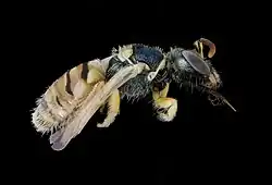Each bee digs its own nest, which has a circular opening about 2 mm in diameter.[3] Each nest proceeds vertically down for about 13–22 cm until it reaches a lower blind passage.[3] Starting past around 5 cm down, around 6–10 side passages branch off, traveling 1–8 cm laterally while sometimes sloping downwards.[3] Tunnels from the side passages lead directly to the brood cells, which are around 5 mm in their longest diameter.[3]