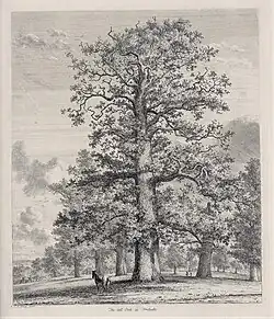 The parkland has been known for its trees since the early 19th century. Thomas Walford in The Scientific Tourist through England, Wales, & Scotland mentioned three "magnificent" oak trees at Fredville named "Majesty", "Stately" and "Beauty".[37] Jacob Strut in Sylva Britannica, or, Portraits of forest trees distinguished for their antiquity, magnitude, or beauty included a plate of Majesty and gave its circumference as 28 feet at eight feet off the ground. Strut described Stately as being of "singularly noble aspect", with its straight 70 foot high trunk. He wrote the three oaks were ". . . a group, which, for magnificence and beauty, is not perhaps exceeded by any other of the same nature; awakening in the mind of the spectator, the most agreeable associations of the freedom and grandeur of woodland scenery, with the security and refinements of cultivated life".[38] The Dover Express in 1901 commented "for gracefulness nothing can exceed the fine specimens of Spanish chestnut trees" and the spread of a "magnificent Horn Bean tree . . . would cover a troop of soldiers".[39] Thomas Pakenham visiting Fredville in 1994 stated the main trunk of the Majesty oak was hollow for 30 feet.[40]