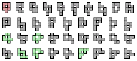 37 nonominoes have holes.[3][4] Therefore a complete set cannot be packed into a rectangle and not all nonominoes have tilings. Of the 1285 free nonominoes, 960 satisfy the Conway criterion and 88 more can form a patch satisfying the criterion. Two additional nonominoes admit tilings, but satisfy neither of the previous criteria.[5] This is the lowest order of polyomino for which such exceptions exist.[6]
