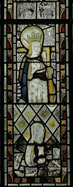 The great east window of the chapel originally held 14th century glass depicting a large scene with full-sized figures. By 1770 the glass was in very bad condition. At that time the rectors of parishes were personally responsible for the financing of repairs to their churches- so the rector of Norbury, the Rev. S. Mills, had the window bricked up with the glass remaining in situ. In 1830 the then rector, the Rev. Thomas Bingham,[21] was approached by a Roman Catholic family of Yorkshire with a view to purchasing the glass. Whether the glass was removed and sold, or stolen (as happened at Haddon Hall), or had disintegrated is not known, but it had disappeared by 1842 when the window was opened up again and filled with 15th century glass taken from the rest of the church windows.[22][23]