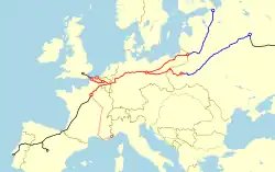 The train left Paris and Ostend (with connection from London) and travelled via Brussels, Cologne, Hanover, Berlin, Königsberg (now Kaliningrad) and Dvinsk (now Daugavpils) to Saint Petersburg. Passengers to and from Russia had to change once in East Prussia at the German/Russian border because Russian railway tracks are of a wider gauge than those in Western Europe. In Paris there was a connecting service to the Sud Express (Southern Express) to Lisbon.