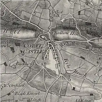 The name "Corfe" is derived from the Old English word, ceorfan, meaning to cut or carve, referring to the gap in the Purbeck hills where Corfe Castle is situated.[1]