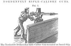 The Nordenfelt gun was a multiple-barrel organ gun that had a row of up to twelve barrels. It was fired by pulling a lever back and forth and ammunition was gravity fed through chutes for each barrel. It was produced in a number of different calibres up to 25 mm (0.98 in). Larger calibres were also used, but for these calibres the design simply permitted rapid manual loading rather than true automatic fire. This article covers the anti-personnel rifle-calibre (typically 0.45 in [11 mm]) gun.