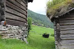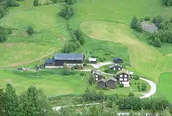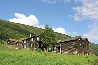 When the current yard was established, after the division in 1851, it was partly with buildings from the former location, partly with new buildings and partly with buildings that were moved from elsewhere. Photographs from the early 1900s show more buildings than those which currently stand on the farm.[13] Here were stables, a piggery and several other outbuildings, but the buildings were not so clearly defined in an inner and outer yard, as they are on som of the other Heidal farms. According to Norske gardsbruk[14] the farm is thought at one time to have comprised 17 buildings, including the mountain farm (summer pasture) and cabins.[15]