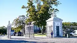 The north side of the Port Authority's building connects to a rough iron fence which defines the northern boundary of the space. It is the only surviving section of the fence that used to surround the Freeport. The fence opens through a gate toward Langelinie. The gate pillars double as guardhouses and they are topped by two zinc statues depicting Neptune and Mercury.