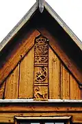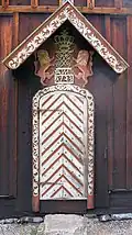 Dendrochronological dating of wood samples indicate that Nore stave church was built after 1167.[3] The church was built with galleries, a chancel and cross naves – an architectural style that was unique in Europe during the Middle Ages. This style has come to be known as Nummedals-type. Decorations are from different periods. Nore is decorated with tendril and animal carvings. Animal characters featured include dragons and lions.