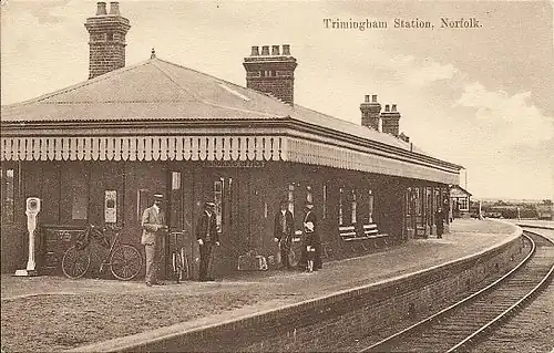Trimingham railway station was a similar design to Overstrand, although access to the platforms was provided by steps from a gateway on a nearby road overbridge. Although the station site has been redeveloped, the bridge and the closed station access remain.[6]
