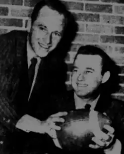 Following World War II, Van Brocklin followed two former high school teammates north and enrolled at the University of Oregon in Eugene.[9] He became the starting quarterback in 1947 under first-year head coach Jim Aiken,[10][11] and led the Ducks to a 16–5 record in his two seasons as a starter. In 1948, Oregon tied with California for the title of the Pacific Coast Conference, forerunner of the Pac-12. California was undefeated overall, and Oregon's only loss was at undefeated Michigan,[12][13] that year's national champions, and the Ducks had seven victories in the PCC to Cal's six.[14] Oregon did not go to the Rose Bowl, however, because Cal was voted by the other schools to represent the PCC in the game. Oregon needed only a 5–5 tie vote, as Cal had been to the game more recently, and with six Northwest schools and four in California, appeared favored to advance. Oregon had opted for a playoff game, but California declined.[15] Among the Cal voters was the University of Washington, which elevated the intensity of the Oregon-Washington rivalry. Breaking with tradition, the PCC allowed Oregon to accept an invitation to play SMU in the Cotton Bowl in Dallas. It was the first time that a Pacific Coast team played in a major bowl game other than the Rose Bowl (a policy which was continued by the Pac-8 through 1974). Both Oregon and California lost their New Year's Day bowl games.[16][17] That season, Van Brocklin was honored with an All-America selection[18] and finished sixth in the Heisman Trophy voting.[19] Coincidentally, the Heisman Trophy winner that year was SMU running back Doak Walker. Both Walker and Van Brocklin got Outstanding Player recognition for their performance in the Cotton Bowl Classic.[20]