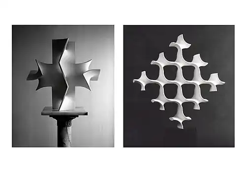 Carlberg's sculptures often consist of repetitions of such a unit, a basic shape capable of combining with other such elements in various ways—somewhat in the way a composer such as Bach or Webern might compose a piece of music by exploring the combinatorial possibilities of a single motivic cell, working within implicit constraints. At Yale, Erwin Hauer was an important influence who prodded Carlberg in this stylistic direction. While both men often employed curvilinear forms as modules, Carlberg more often used relatively geometric, hard-edged design units, often combining curves with straight edges (or flat planes) in the same module. His prints, mostly dating after 1970, show a similar preoccupation with precision, simplicity, and modularity. Some are actually groups of prints, placed contiguously together on a wall, with each print conceived as a module.[9]