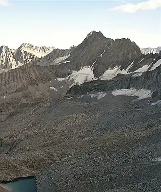 Norman Clyde Peak, standing 13,970 feet (4,258 m) tall, is in natural company among the high peaks of the Palisades region of the Sierra Nevada in California. It raises on the main ridge of the Palisades', between Middle Palisade and Palisade Crest. Norman Clyde Glacier on its north face, and Middle Palisade Glacier on its east both feed the headwaters of the South Fork of Big Pine Creek. It is named posthumously for mountaineer Norman Clyde, who first climbed it by way of the Norman Clyde Glacier in 1930.[6]