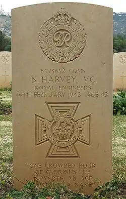 Company Quartermaster Sergeant Norman Harvey VC (6 April 1899 –16 February 1942) was a British Army soldier and an English recipient of the Victoria Cross, the highest and most prestigious award for gallantry in the face of the enemy that can be awarded to British and Commonwealth forces. He re-enlisted in World War II and was killed in action.