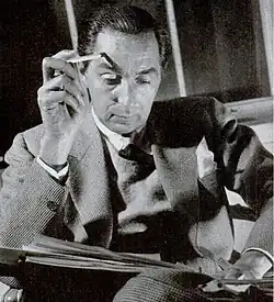 Although Norell made annual trips to Paris after World War II to purchase fabric and traveled across the United States to show and sell his work, he remained a New York City resident for the rest of his life. Norell turned down an offer from Harry Cohn, head of Columbia Pictures, to move to Hollywood and create costume designs for the film studio.[14][15] During the 1950s Norell's biannual shows of his collection at his firm's New York City showroom at 550 Seventh Avenue were lavish, black tie events.[18] Norell received his second Coty Award in 1951 and became the first winner of the fashion industry critics' Hall of Fame award in 1956, the same year Norell designed Marilyn Monroe's wedding dress for her marriage to playwright Arthur Miller.[19]