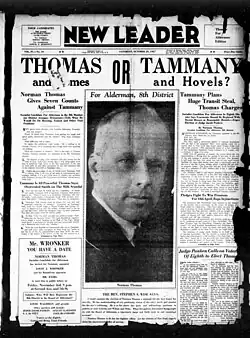 It was Thomas's position as a conscientious objector that drew him to the Socialist Party of America (SPA), a staunchly antimilitarist organization. When SPA leader Morris Hillquit made his campaign for mayor of New York in 1917 on an antiwar platform, Thomas wrote to him expressing his good wishes. To his surprise, Hillquit wrote back, encouraging the young minister to work for his campaign, which Thomas energetically did.[7] Soon thereafter he himself joined the Socialist Party.[8] Thomas was a Christian socialist.[9]