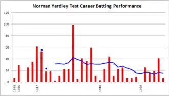 Yardley's only other representative appearance in 1948 was as captain of the Gentlemen against the Players at Lords, where he scored 61.[62] In the whole season, he scored 1,061 runs at an average of 29.47 and 14 wickets at an average of 35.14—he took just five wickets outside of the Tests.[10][11]