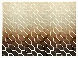 "...small collages which combined with an active calligraphy with placement of bright colored chips against a mahogany lacquer ground." — Artforum Vol. No. 6, Henry Hopkins, November 1962[6]
