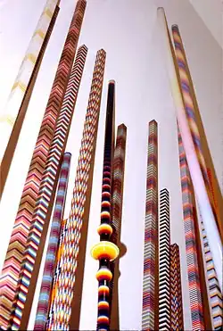 These 30 sculptures, 8 to 10-foot long, 1¼-inch square, round, octagonal, hexagonal or spindled, were constructed with solid color acrylics in an order of color frequencies, then laminated and polished. The final pole combined the transparent, translucent and opaque in a combination varying from matte to high gloss.