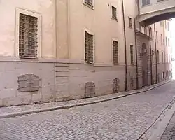 The alley passes north of Södra Bankohuset, the former building of the Bank of Sweden, constructed by the architect Nicodemus Tessin the Elder (1615–1684) during the period 1666–1682. On various maps it is recorded as Banco-gränden (1729) and Norra Bancogränd (1733).[1]