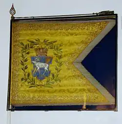 The unit presents one guidon. Its first was presented on 30 September 1902 by major general Carl Warberg.[4] A new one was presented to the regiment by the Chief of the Army, lieutenant general, count Carl August Ehrenswärd at the regimental barracks in Umeå on 20 September 1955. The guidon is drawn by Brita Grep and embroidered by hand in insertion technique by the company Libraria.[5] Blazon: "On swallow-tailed blue cloth the provincial badge of Jämtland; a white elk passant, attacked on its back by a rising falcon and in the front by a rampant dog, both yellow. On a white border at the upper side of the guidon, battle honours (Nowodwor 1655) in blue. Blue fringe."[5] From 1957, the regimental letters as replaced from "NDR" to "ND", when the regiment was to be reduced to a battalion in 1958.[4]