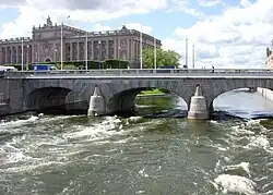 Norrström is one of the shortest rivers in Europe in central Stockholm. It connects Lake Mälaren with the Baltic Sea. It runs from Riddarfjärden, north of Gamla stan, to Stockholms ström (the western part of Saltsjön). Two islands lie within it, Strömsborg and Helgeandsholmen. It is one of two natural waterways between Mälaren and the Baltic sea, the other being Söderström south of Gamla stan. Norrström is crossed by Centralbron and the adjacent pedestrian bridge, Vasabron, Riksbron north of Helgeandsholmen which continues into Riksgatan and Stallbron south of the island, Norrbro crossing Helgeandsholmen, and Strömbron.