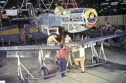 The other feature was a new cooling arrangement positioned aft (single ducted water and oil radiators assembly) that reduced the fuselage drag and effects on the wing. Later,[22] after much development, they discovered that the cooling assembly could take advantage of the Meredith effect, in which heated air exited the radiator with a slight amount of jet thrust. Because NAA lacked a suitable wind tunnel to test this feature, it used the GALCIT 3.0 m (10 ft) wind tunnel at the California Institute of Technology. This led to some controversy over whether the Mustang's cooling system aerodynamics were developed by NAA's engineer Schmued or by Curtiss, as NAA had purchased the complete set of P-40 wind tunnel data and flight test reports.[23][24] The NA-73X was also one of the first aircraft to have a fuselage lofted mathematically using conic sections; this resulted in smooth, low-drag surfaces.[25] To aid production, the airframe was divided into five main sections—forward, center, rear fuselage, and two wing halves—all of which were fitted with wiring and piping before being joined.[25]