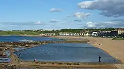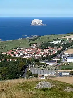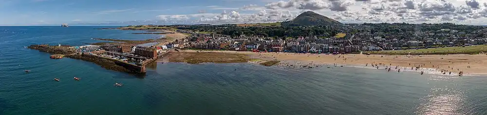 North Berwick (/ˈbɛrɪk/; Scottish Gaelic: Bearaig a Tuath)[2] is a seaside town and former royal burgh in East Lothian, Scotland. It is situated on the south shore of the Firth of Forth, approximately 20 miles (32 km) east-northeast of Edinburgh. North Berwick became a fashionable holiday resort in the nineteenth century because of its two sandy bays, the East (or Milsey) Bay and the West Bay, and continues to attract holidaymakers. Golf courses at the ends of each bay are open to visitors.