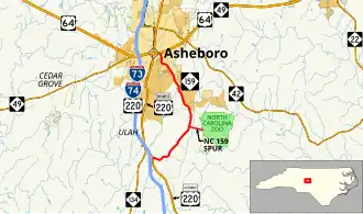 Established in 1979 when NC 159 was redirected south to US 220. Its purpose is to connect the North Carolina Zoological Park with mainline NC 159. Though not signed along its route, it is listed on state and county maps and is the only known spur route in North Carolina.[6]