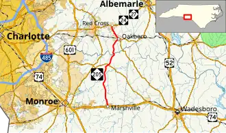 Established in 1935, it is the second incarnation NC 205, creating a new primary routing between the towns of Marshville and Red Cross. In the late 1940s, it was extended southwest along Main Street to the new alignment of US 74; it then changed by 1953 onto a new extension of Elm Street to US 74, leaving Main Street.[2]