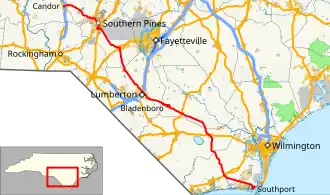 North Carolina Highway 211 (NC 211) is a 162.5-mile-long (261.5 km) primary state highway in the U.S. state of North Carolina. It traverses mostly through the Sandhills and Coastal Plain regions of the state; connecting the cities of Candor, Aberdeen, Raeford, Lumberton, Bladenboro, and Southport.