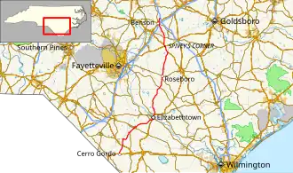 NC 242 is a 94.2-mile (151.6 km) long rural highway that goes from US 76 in Cerro Gordo, to I-40, near Benson. It passes through Columbus, Bladen, Cumberland, Sampson and Johnston Counties. Some major cities, and towns it goes through are Cerro Gordo, Bladenboro, Elizabethtown, Roseboro, Spiveys Corner and Benson.
