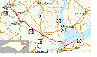 The entire route is in Windsor, Bertie County.