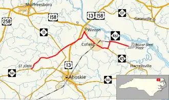NC 461 was established in 1964 as a new primary routing from NC 561 in Saint John to US 13 south of Winton.[2] In 1999, NC 461 was extended east, with a short concurrency with US 13 it splits near Winton, where it follows along Old Highway 13 to NC 45, then in concurrency until Farmers Chemical Road, where it continues as a new primary spur to the steel plant.[3]