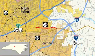 The highway provides indirect access between High Point and Interstate 85/Interstate 74.