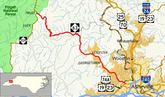 NC 63 is a 26.9-mile (43.3 km) two-lane mountain highway that begins at the community of Trust at NC 209. Going east, it stays along the north bank of the Friezeland Creek before climbing to its highest point at Doggett Gap. It quickly descends down 1,500 ft (460 m) to the mountain valley area below, in what can be described as aggressively twisty. Along the banks of Little Sandymush Creek, it passes through the community of Canto as it enters Buncombe County. After passing by Grassy Knob, NC 63 stops being a hard mountain highway, as it goes through Leicester and finally into Asheville, where it ends at Patton Avenue. Patton Avenue here carries U.S. Routes 19, 23, and 74A.[1]