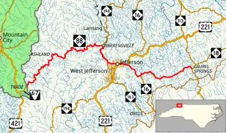 North Carolina Highway 88 (NC 88) is a 41.3-mile-long (66.5 km) primary state highway in the U.S. state of North Carolina. Primarily in the High Country, it runs from the Tennessee state line near Trade east to NC 18 in Laurel Springs.